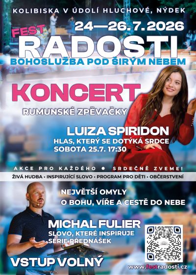🙌 Sobota – den inspirace a hudby (25. 7.) Sobota přináší hlubší témata, rozhovory i silný hudební zážitek. Program zahrnuje: moderované setkání o víře a životě program pro děti – příběhy a zážitky naživo přednášky Michala Fuliera: „Největší omyl o tom, jak se dostat do nebe“ „Jak zabránit duchovní deformaci“ přátelské občerstvení zdarma 🎶 Vrchol večera: koncert rumunské zpěvačky Luizy Spiridon (hlas, který se dotýká srdce)