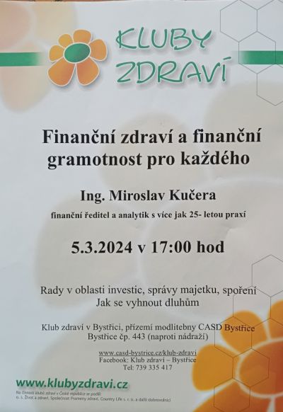 Klub zdraví Bystřice vás zve na přednášku Finanční zdraví a finanční gramotnost pro každého.