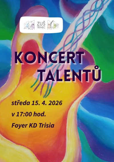 Srdečně zveme na Koncert talentů, který se uskuteční ve středu 15. 4. 2026 v 17:00 ve foyer KD Trisia. Na koncertě vystoupí žáci, kteří v letošním školním roce dosáhli významných úspěchů v soutěžích a přehlídkách. Těšíme se na Vás!