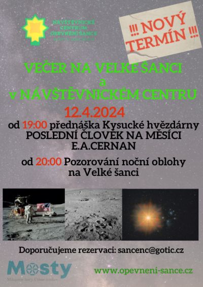Nejdříve se díky přednášce "Poslední člověk na Měsíci E. A. Cernan" vrátíme do roku 1972 a podíváme na Měsíc. Zjistíme, že ten, kdo po něm kráčel jako poslední, měl své kořeny v nedaleké obci Vysoká nad Kysucou. Po přednášce se přesuneme ven do opevnění Velká šance a budeme pozorovat noční oblohu.