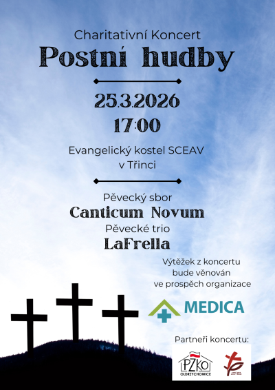 Srdečně Vás zveme na Charitativní koncert postní hudby a slova, kferý se uskuteční od 17.00 hodin v evangelickém kostele v Třinci.