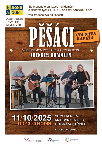 vás srdečně zveme na koncert country kapely Pěšáci s nevidomým kytaristou Zdenkem Hradilem v rámci 31. ročníku festivalu Dny umění nevidomých.
