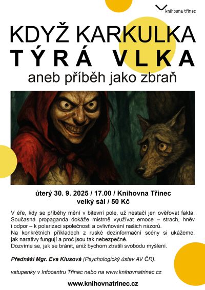 Na přednášce nazvané Když Karkulka týrá vlka bude Mgr. Eva Klusová (Psychologický ústav AV ČR) mluvit o tom, že éře, kdy se příběhy mění v bitevní pole, už nestačí jen ověřovat fakta. Současná propaganda dokáže mistrně využívat emoce – strach, hněv i odpor – k polarizaci společnosti a ovlivňování našich názorů. Na konkrétních příkladech z ruské dezinformační scény si ukážeme, jak narativy fungují a proč jsou tak nebezpečné. Dozvíme se, jak se bránit, aniž bychom ztratili svobodu myšlení.