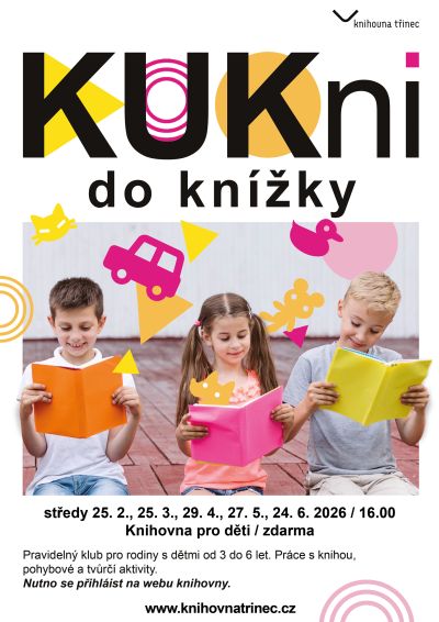 V roce 2026 se bude KUKni konat jednou měsíčně ve středu od 16:00 v Knihovně pro děti, a to konkrétně v termínech: 25. 2., 25. 3., 29. 4., 27. 5. a 24. 6.