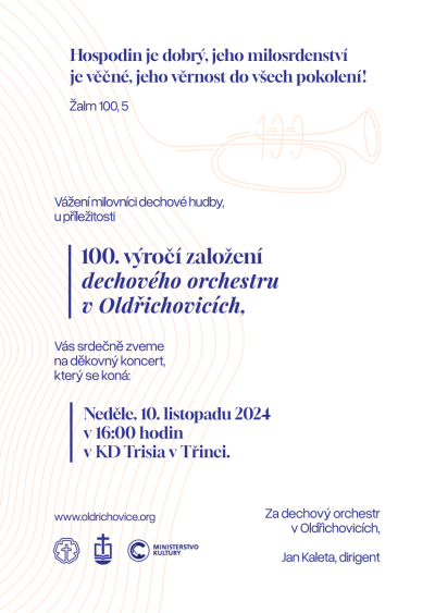 s velkou vděčností vás i vaše blízké zveme na jubilejní koncert u příležitosti 100. výročí založení dechového orchestru v Oldřichovicích.