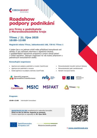 V jeden čas a na jednom místě máte příležitost konzultovat své záměry či jen načerpat informace o dotačních titulech z nejžádanějších operačních programů a jiných zdrojů dotací v České republice. Zástupci organizací na vás budou připraveni u jednotlivých konzultačních stolků. Akce se bude konat v úterý 21. října 2025 od 10:00 do 12:00 hodin ve Velké zasedací místnosti Magistrátu města Třince. Účast na Roadshow je ZDARMA.