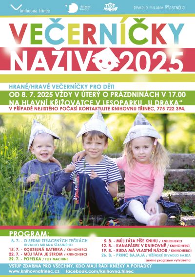Hrajeme již tradičně na velké křižovatce v lesparku. V případě špatného počasí se program přesouvá do knihovny. Nejaktuálnější info sledujte na Facebooku nebo Instagramu.