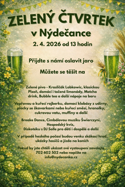 Srdečně Vás zveme na Zelený čtvrtek v Nýdečance, který se ponese v příjemné atmosféře pro děti i dospělé s doprovodným programem. Připraveno bude občerstvení, hudba i prostor pro vystoupení v talentovou soutěži zakončená diskotékou.